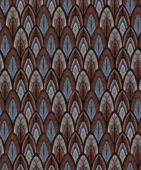 Zart geprägte Vliestapete, Blattmotiv in Braun/Terrakotta-, Grau-Beige- und halbglänzendem Blau-Ton. Das Foto des Innenraums dient nur der Veranschaulichung – verschiedene Farben.