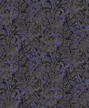 Zart geprägte Vliestapete, schwarzer Hintergrund, graue und halbglänzende blaue Blumen und Blätter.