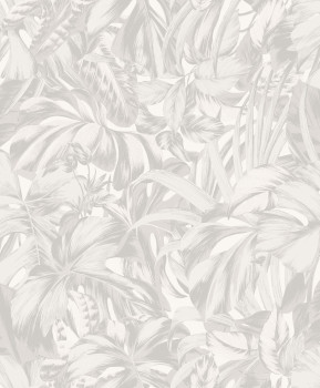 Grau-weiße Vliestapete, Motiv tropischer Blätter.