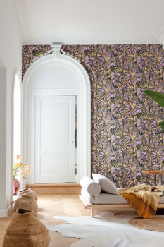 Vliestapete, Motiv tropischer Blätter in Braun-, Lila- und Beigetönen.