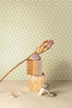 Vliestapete, geometrische Muster inspiriert von Naturmaterialien in Creme- und Grüntönen.
