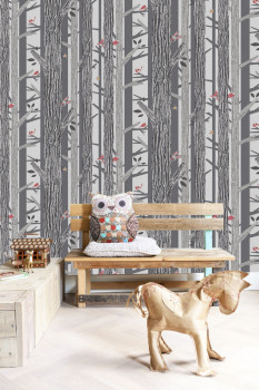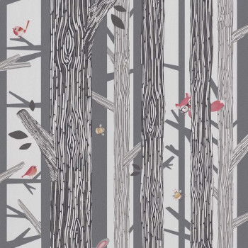 Vliestapete für Kinder. Tiere, Vögel und Bienen im Wald. Grau-schwarze Farbtöne, Tiere in grauen, rosa und gelben Farben.