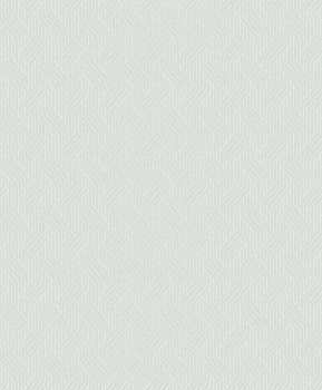 Graugrüne Vliestapete, ineinander verschlungene weiße Linien bilden geometrische 3D-Muster.