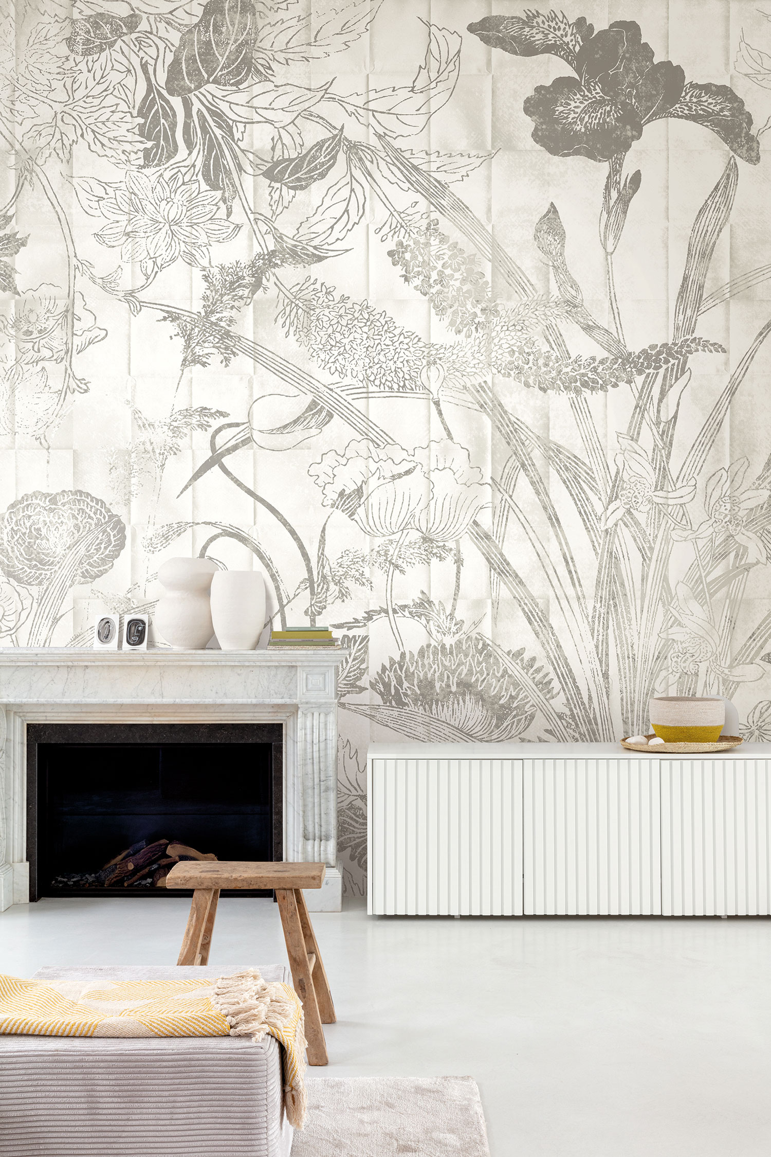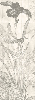 Graue Vliestapete mit Motiven aus Blumen und Blättern. Kombinierbar mit den Fototapeten DG3LEI1011 und DG3LEI1012 für größere Breite - siehe Foto.