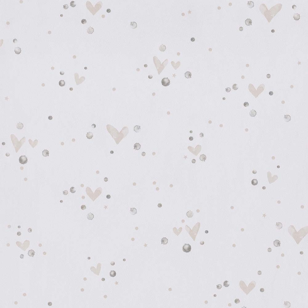 Weiße Vliestapete. Beige Herzen, graue Kleckse und glänzende beige Kreise und Sterne.