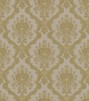 Luxuriöse Vliestapete mit Vinyloberfläche - goldenes, geprägtes Damastmuster auf halbglänzendem, beigen Stoffhintergrund. Das Foto des Innenraums dient nur zur Veranschaulichung – verschiedene Farben.