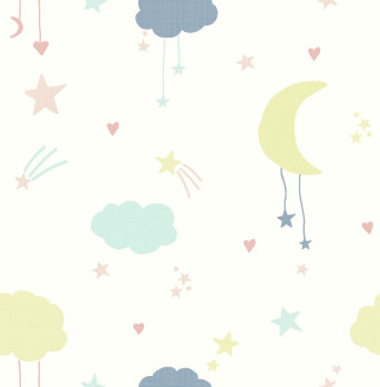 Weiße Vliestapete, Kindermotive aus Wolken und Sternen in Pastellgelb, Blau und Rosa. Dieses bezaubernde Tapetendesign ist perfekt, um eine beruhigende Atmosphäre für Ihr Kind zu schaffen. Dieses entzückende Kindermotiv zeigt Wolken, Monde und Sterne. Diese Tapete ist für ein modernes Gefühl auf mattem Papier gedruckt und lässt sich leicht anbringen.
