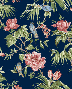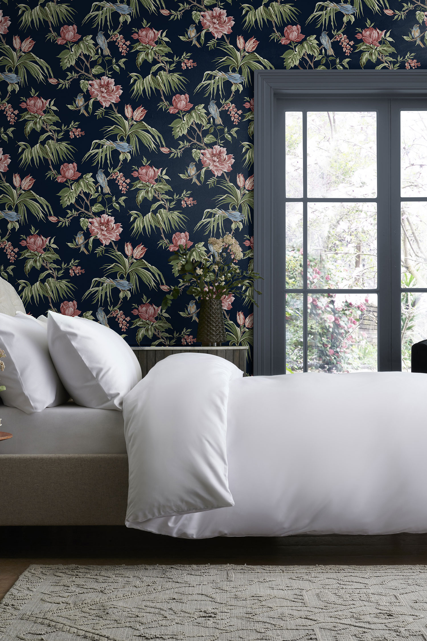 Romantische dunkelblaue Vliestapete mit Vögeln und blühenden Zweigen. Birds and Blooms ist eine wunderschöne Blumentapete mit majestätischen Vögeln, die auf Zweigen sitzen. Dieses wunderschöne Design ist in den Farben Entenei, Lila, Grau und Marineblau erhältlich. Dieses elegante, auf mattes Papier gedruckte Design hat eine luxuriöse Oberfläche und lässt sich auch leicht an die Wand kleben.