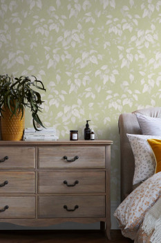 Glatte grüne Vliestapete, Motive aus Zweigen und Blättern. Trial Flower ist eine schlichte, aber schöne Tapete mit einem aufwendigen Design aus Blättern und Zweigen. Hergestellt in drei wunderschönen Enteneifarben: Grün und Grau. Dieses auf mattem Papier gedruckte Design hat eine luxuriöse Oberfläche und haftet leicht an der Wand.