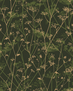 Grüne Vliestapete, Motiv von Wiesengräsern in Grün- und Goldtönen.