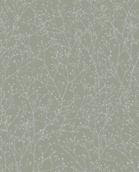 Frühlingsgrüne Vliestapete, Motiv aus kleinen silbernen Zweigen.