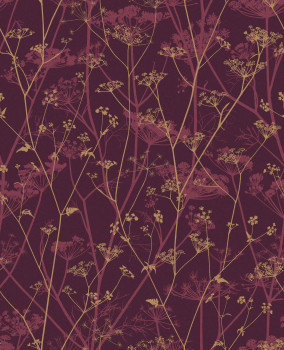 Weinrote Vliestapete, Motiv von Wiesengräsern in Rosa- und Goldtönen.