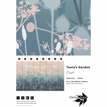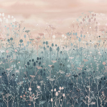 Atemberaubende Fototapete Tanias Garten erinnert an eine Wildblumenwiese in der Abenddämmerung in einer rauchigen Rouge- und dunstigen Grau-Ombre-Palette. Der Entwurf wurde von einem von Clarissas Lieblingsorten inspiriert – dem magischen Garten ihrer Freundin und renommierten Gartendesignerin Tania Compton. Ein üppiges Gewirr aus Gräsern, Dillsamenköpfen und Eisenkraut fängt die Essenz wilder und natürlicher Schönheit ein.