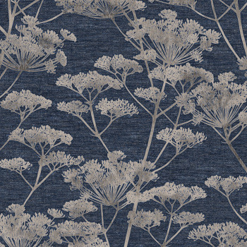 Luxuriöse blaue Vliestapete mit Wiesenmotiv in Bronze-/Roségold-Tönen.