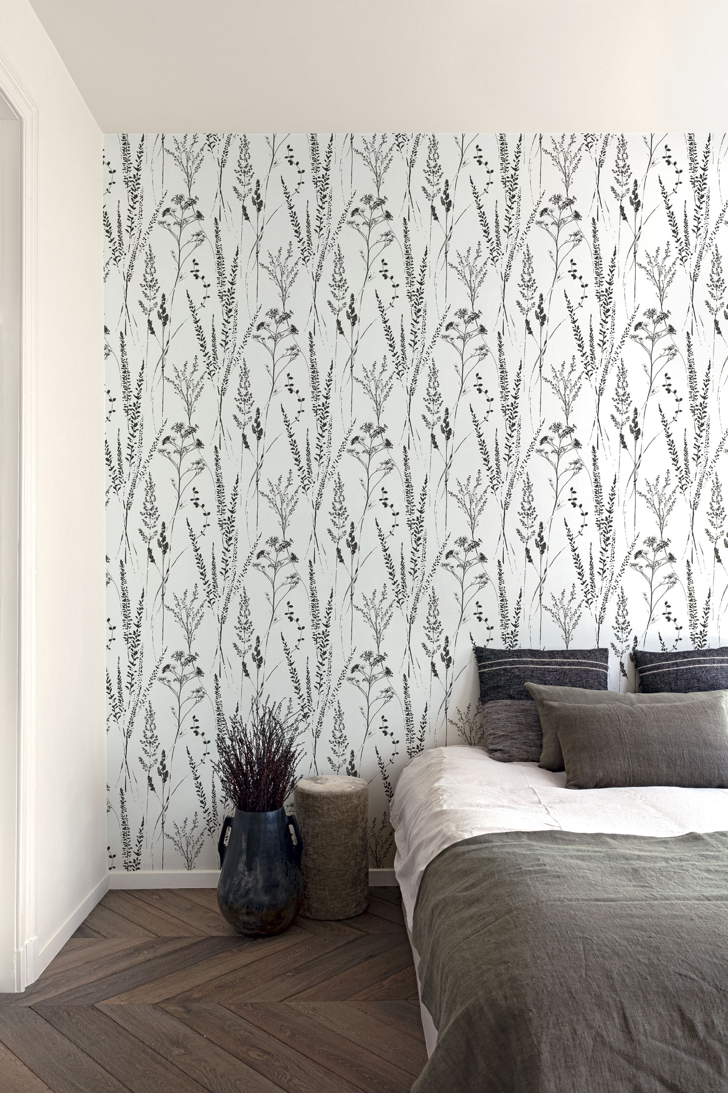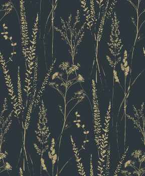 Weiße Vliestapete mit Vinyloberfläche, Motiv schwarzer Wiesengräser.