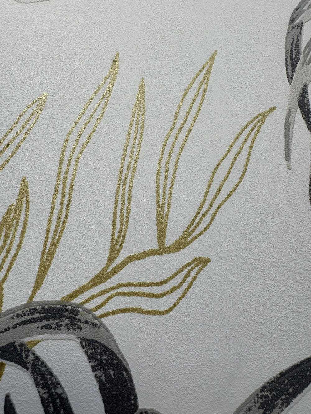 Cremefarbene Vliestapete mit Vinyloberfläche, Motive tropischer Blätter in Grau- und Ockertönen, stellenweise mit goldenen Akzenten.