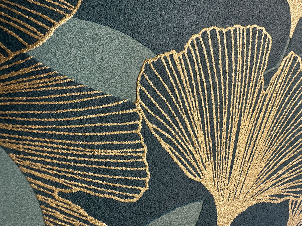 Schwarze Vliestapete mit Vinyloberfläche, Motiven aus Gold und grün/khakifarbenen Ginkgoblättern.