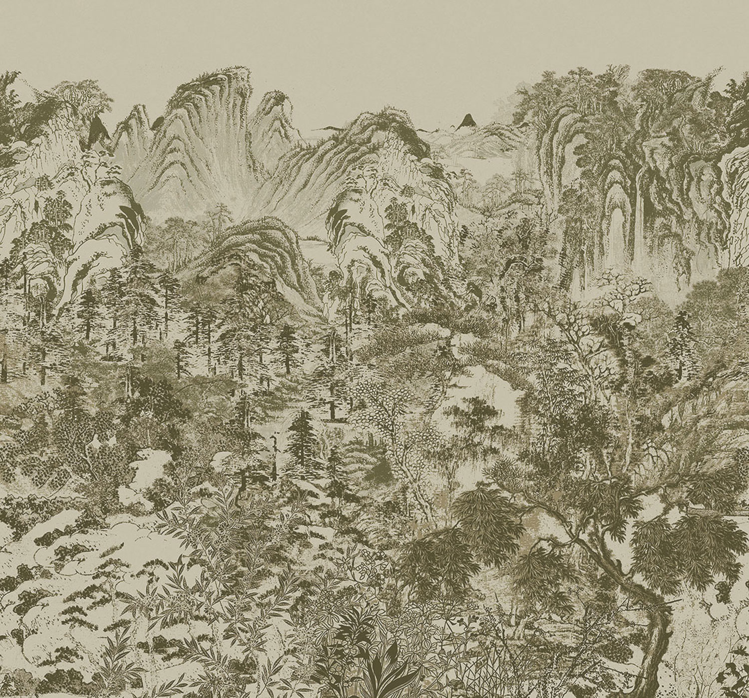 Vlies-Fototapete in Grüntönen, Berglandschaftsmotiv. 300x280cm ( 4 Paneele ) Die Fototapete hat ein durchgehendes Muster, für eine größere Breite müssen Sie nur ein weiteres Stück kaufen. Das Innenfoto dient nur zur Veranschaulichung - verschiedene Farbe