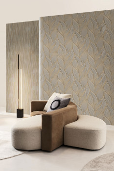 Luxuriöse Vliestapete mit Vinyloberfläche, braun-goldenen und silbernen Reflexen, geprägter Stoffstruktur.