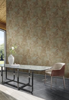 Luxuriöse Vliestapete mit Vinyloberfläche, geprägte Blattmotive in halbglänzenden Braun-, Braun-Gold- und Grüntönen, gröbere Stoffstruktur.