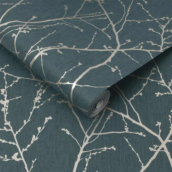 Grüne geprägte Vliestapete, Stoffstruktur, glatte metallische Zweige, helles Gold.
