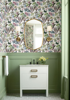 Weiße Vliestapete, Blumen und Schmetterlinge in Grün-, Burgunderrot-, Blau- und Beigetönen.
