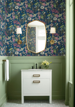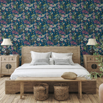 Dunkelblaue Vliestapete, Blumen und Schmetterlinge in Grün-, Rosa-, Grau- und Brauntönen.