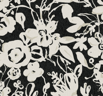 Vliestapete, grau-weiße Blumen mit beigen Details auf schwarzem Hintergrund, handgemalter Effekt.