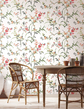 Florale Vliestapete, blühende Zweige in Grün-, Rot- und Lachstönen, weißer Hintergrund.