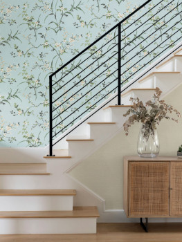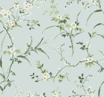 Florale Vliestapete, blühende Zweige in Grün-, Weiß- und Grautönen mit metallischen Details, hellblauer Hintergrund.
