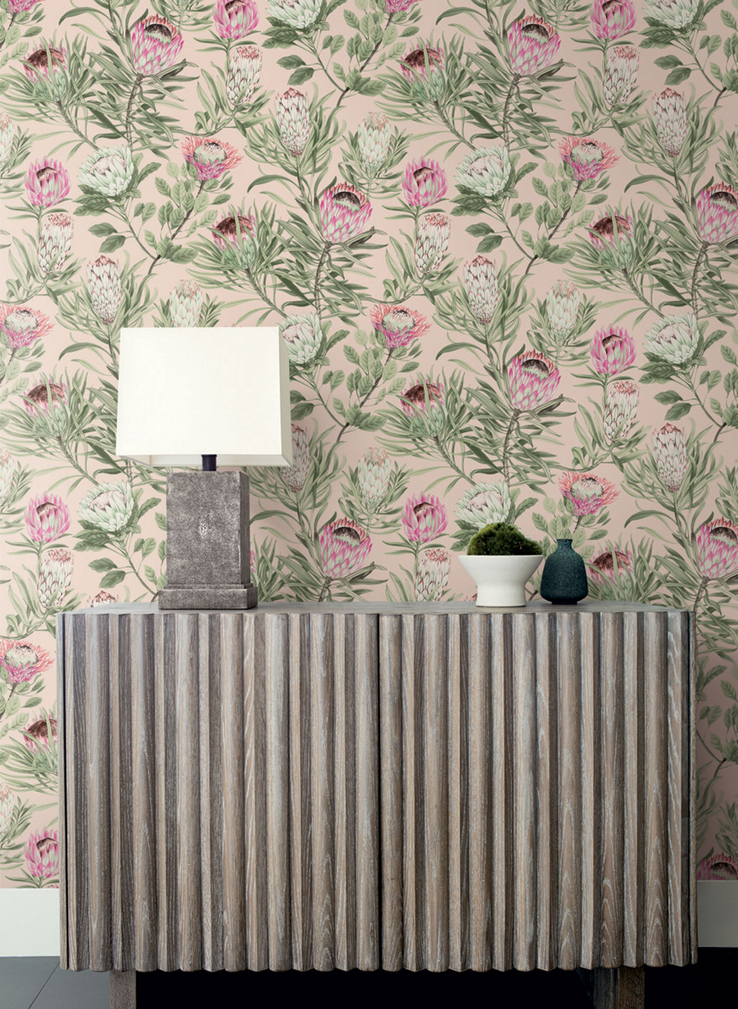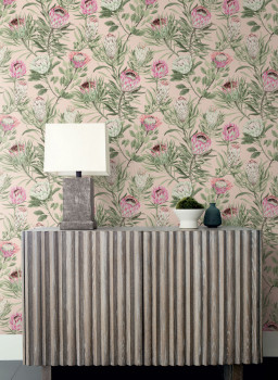 Beige Vliestapete, exotisches Protea-Blumenmotiv in Grün-, Rosa- und Rottönen.