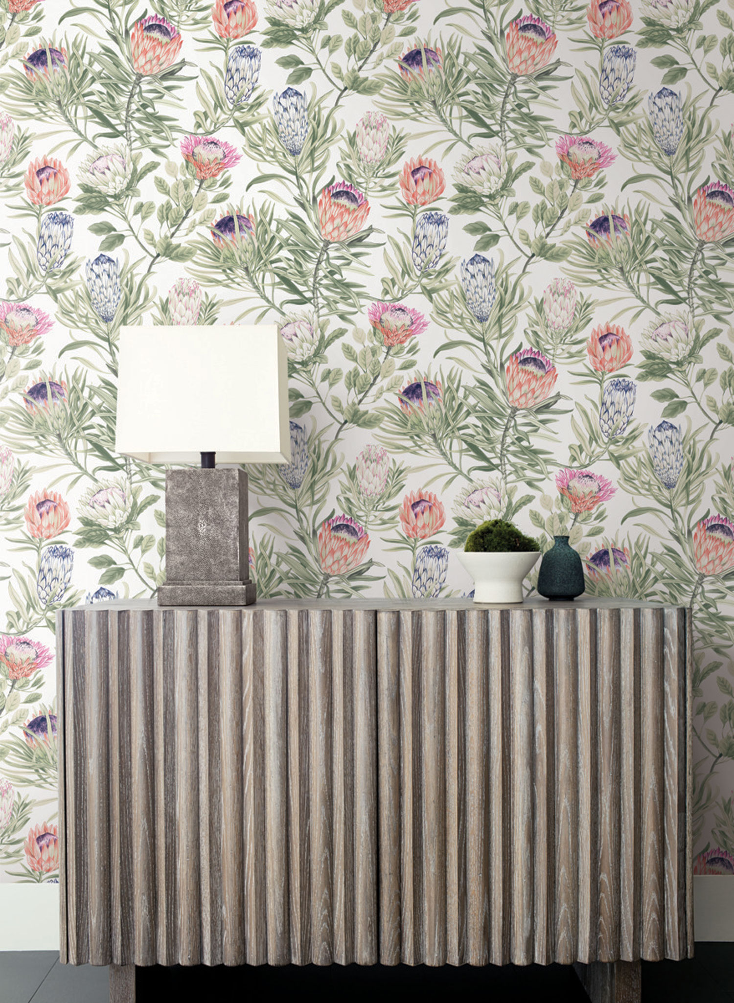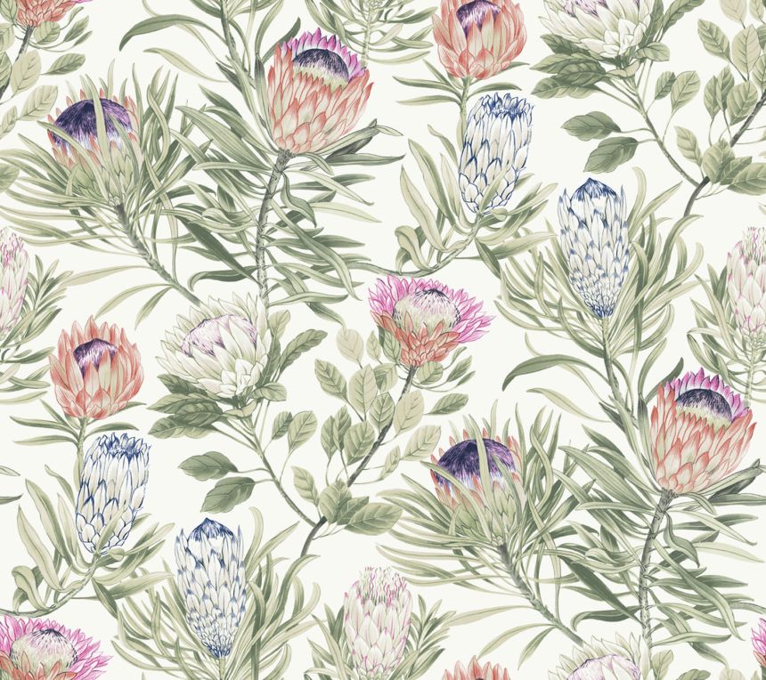 Weiße Vliestapete, exotisches Protea-Blumenmotiv in Grün-, Blau-, Rot- und Beigetönen.