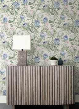 Hellbeige Vliestapete, exotisches Protea-Blumenmotiv in Grün-, Blau- und Rottönen.