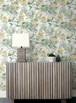 Weiße Vliestapete, exotisches Protea-Blumenmotiv in Grün-, Gelb- und Türkistönen.