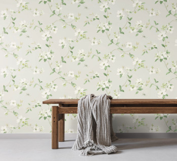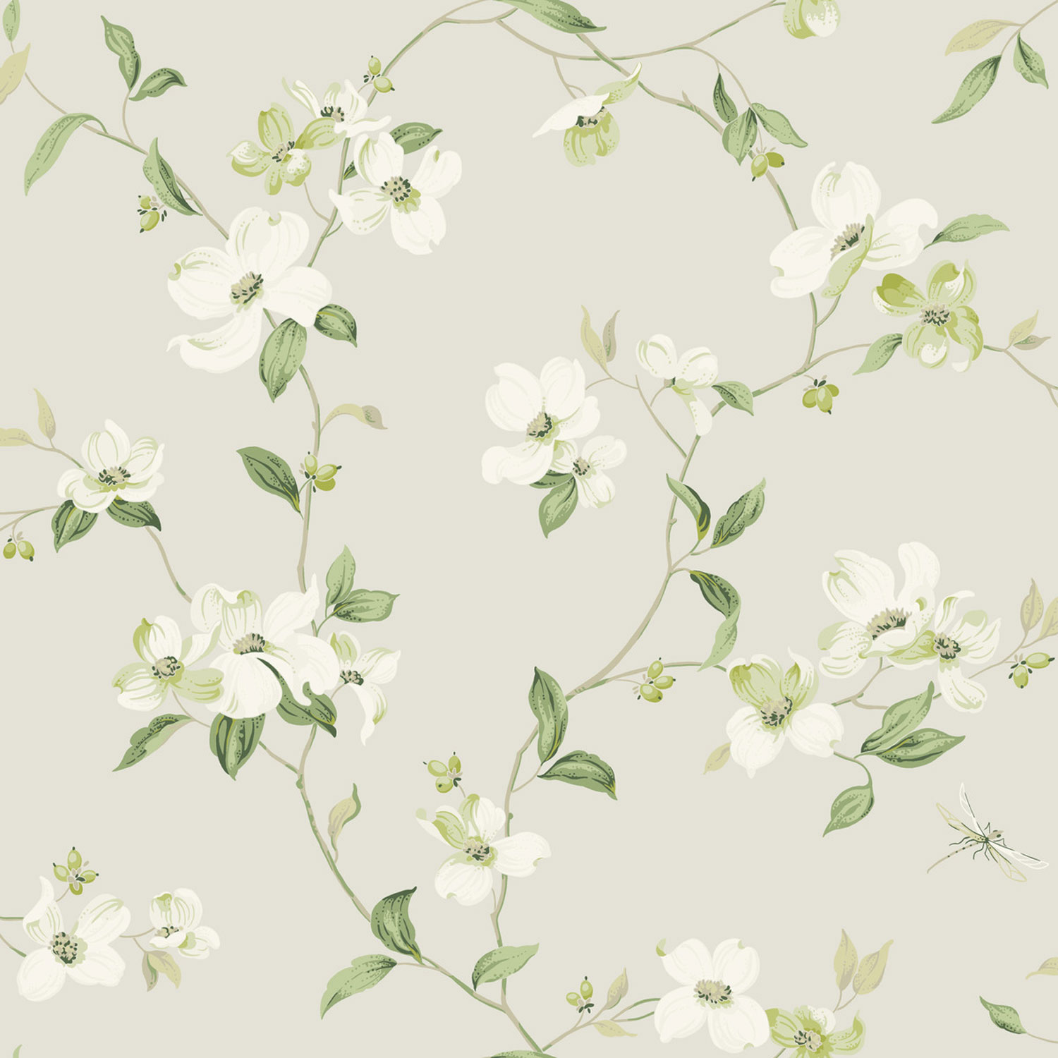 Hellgraue Vliestapete, zart geprägte Hartriegelblüten in Weiß- und Grüntönen.