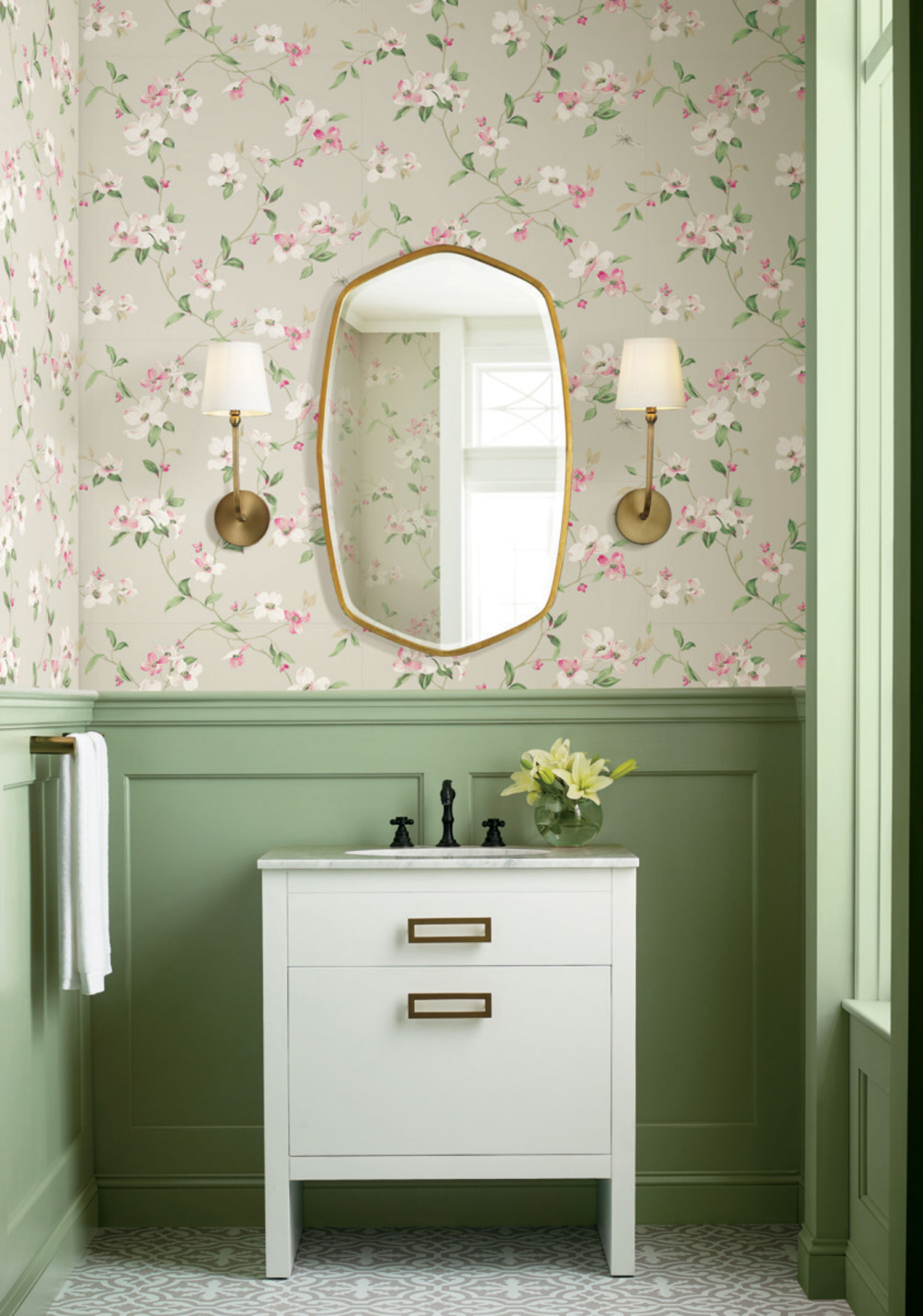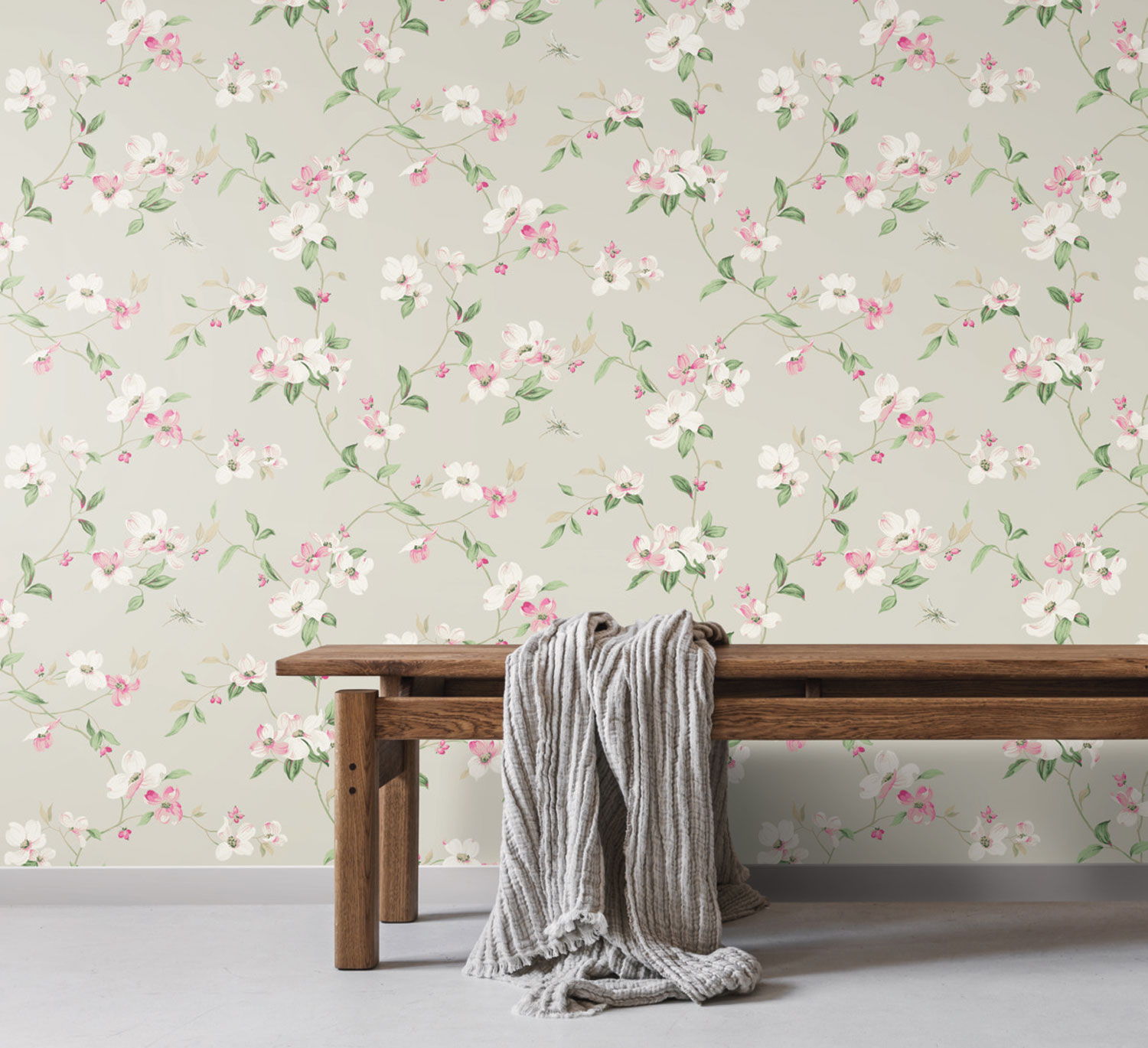 Beige Vliestapete, zart geprägte Hartriegelblüten in Rosa-, Weiß-, Beige- und Grüntönen.