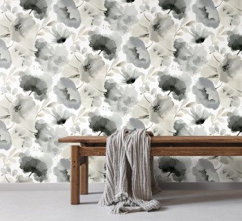 Grau-beige florale Vliestapete, Aquarelleffekt.