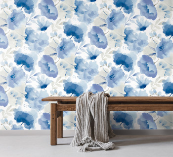 Graublaue florale Vliestapete, weißer Hintergrund, Aquarelleffekt.