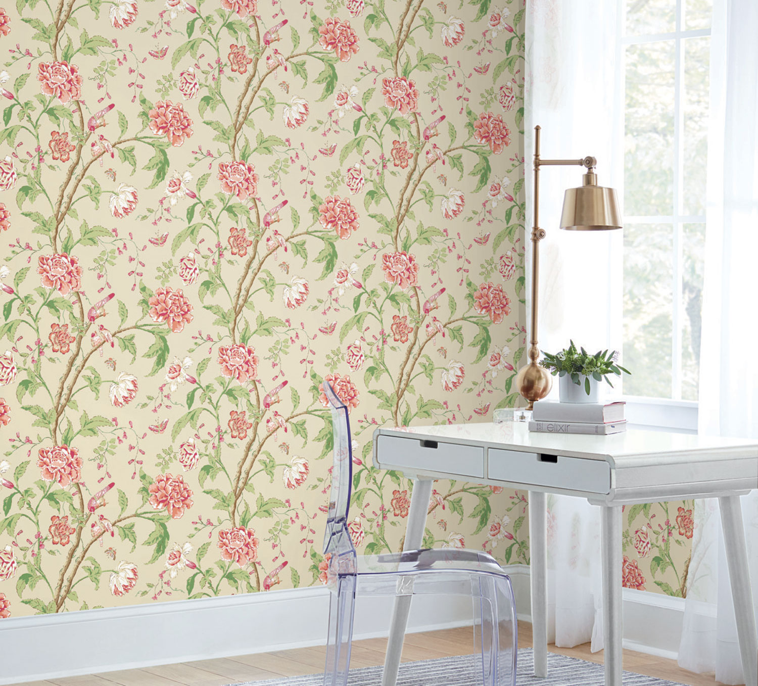 Hellbeige Vliestapete, blühende Zweige in Korallen-, Grün- und Cremetönen, Schmetterlinge und Vögel.