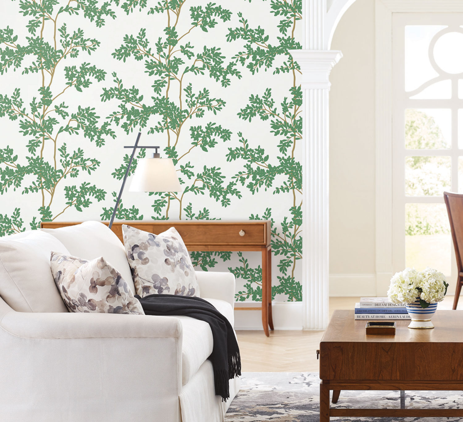 Weiße Vliestapete, Zweige in Grüntönen und Metallic-Gold.