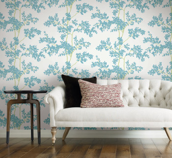 Weiße Vliestapete, Zweige in Blau- und Limettentönen.
