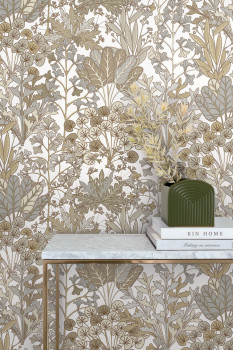 emefarbene Vliestapete, Pflanzen und Blätter in Braun-, Grau- und Beigetönen, goldene Konturen.