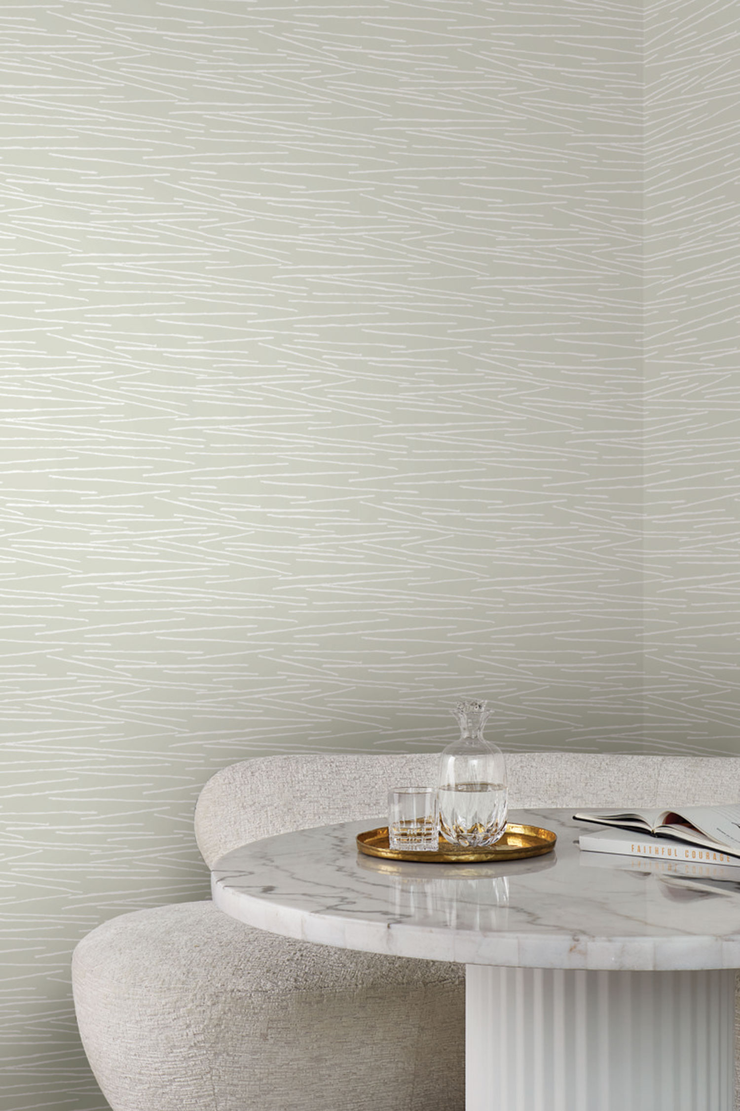 Graugrüne Vliestapete, unregelmäßige, weiße, geprägte Linien.