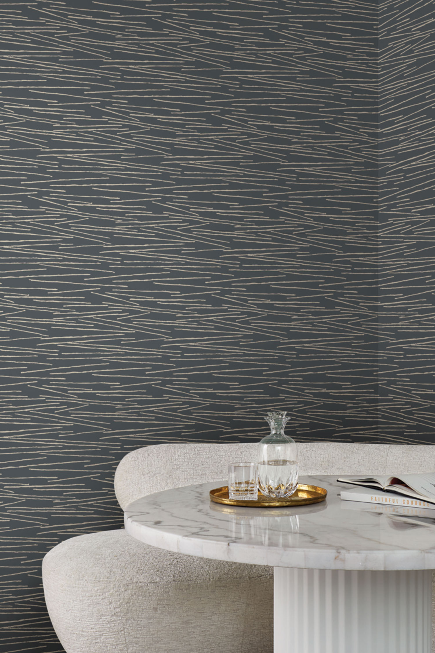Schwarze Vliestapete, unregelmäßige, beige, geprägte Linien.