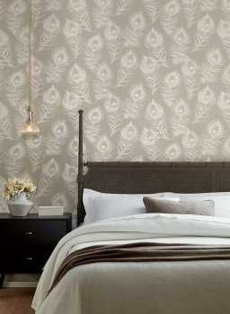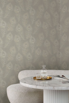 Graue Vliestapete, Motive von Pfauenfedern in Grau- und Silbertönen.