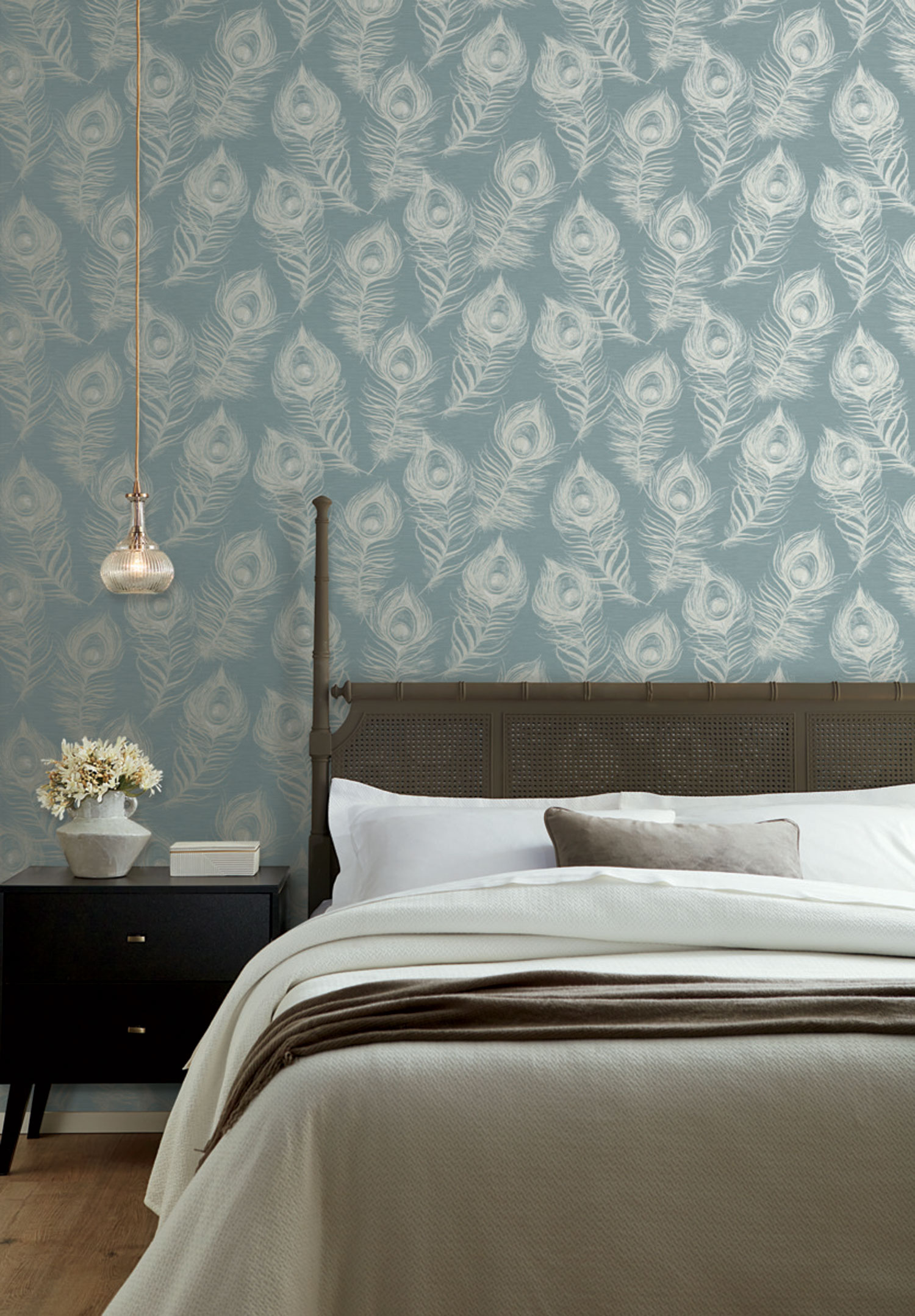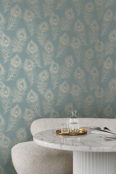 Blaue Vliestapete, Motive aus Pfauenfedern in Grau- und Goldtönen.