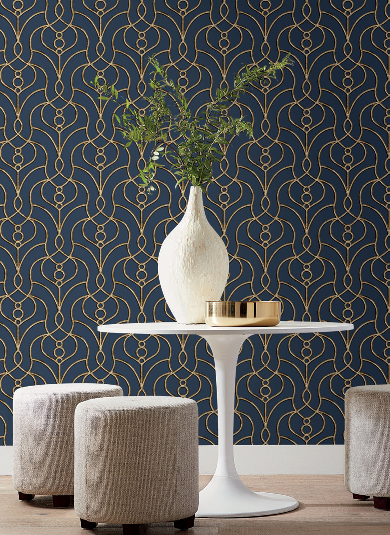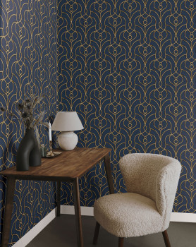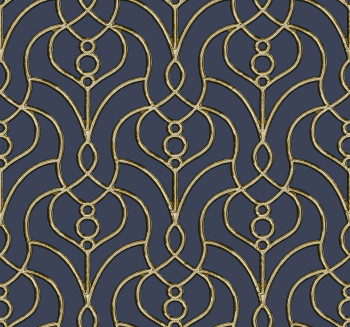 Blaue Vliestapete, Dekor aus dekorativen braun-goldenen Beschlägen.