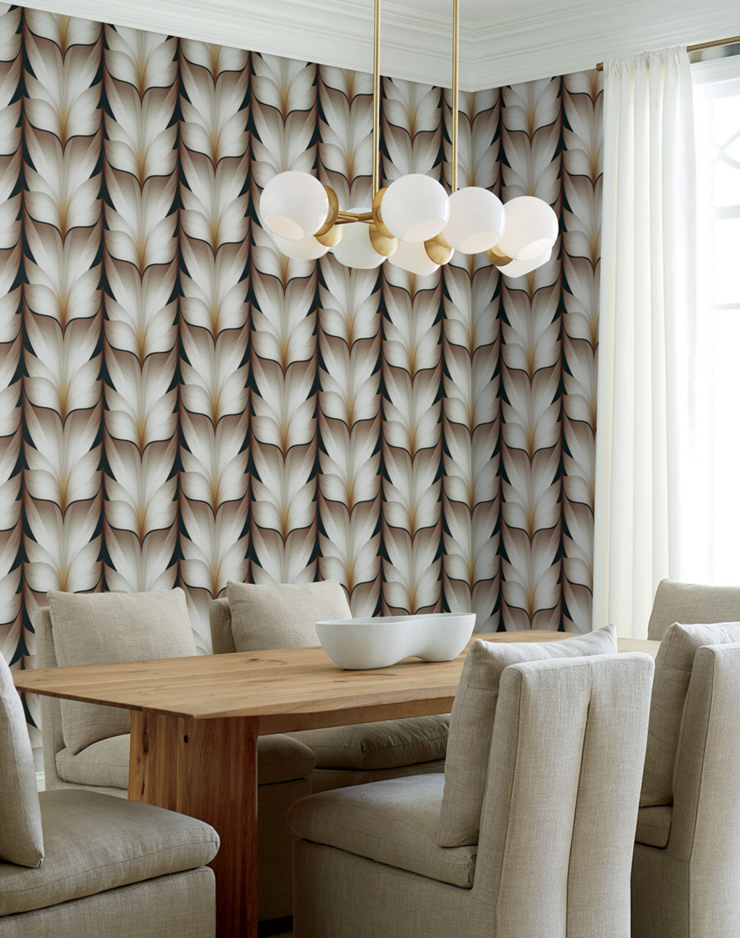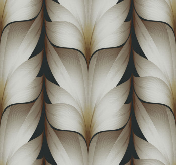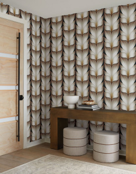 Effektvolle geometrische Vliestapete in den Farbtönen Schwarz, Braun und Grauweiß.