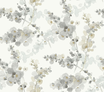Weiße Vliestapete, Blumenmuster erinnert an ein Aquarellgemälde, Grau- und Beigetöne, metallische Details.