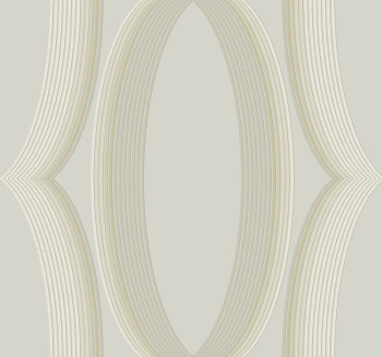 Hellgraue Vliestapete, großes geometrisches Muster in Grau-, Beige- und Ockertönen.